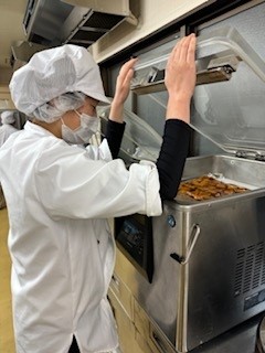 調理師の近藤さんは「大変だけど、やりがいがあります。味も染み込み、鶏肉は軟らかくなるので利用者様は食べやすいと思います。」異動してきてから、近藤さんは納品のことや真空調理のことなど丁寧に教えてくれます。