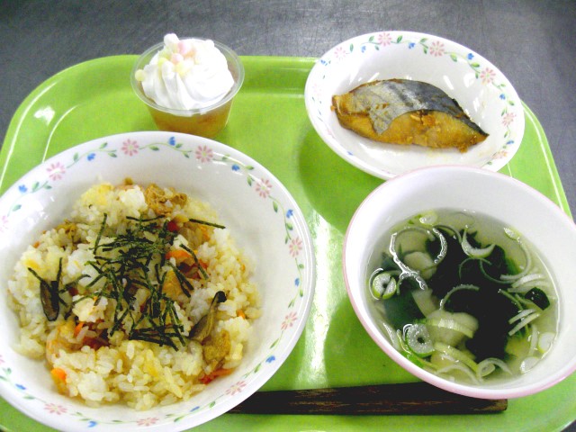 開校記念日には学校の誕生日ということで、お赤飯と鯛のかまの塩焼きです。骨だらけのかまですが楽しく黙々と食べていました。鯛のかまにある「鯛の鯛」といわれる魚の形の骨を探すためです。低学年は中々うまく探せませんが3年生以上は得意になってみつけます。そして家に持ち帰ります。魚には骨があって当たり前と自然に身についていきます。そして骨がある魚でも、おいしい魚として食べられます。愛媛県の愛南町、鯛の養殖で有名なところですが、5年生の社会科で漁業の学習から繋がったことで実現できました。どんなものでも出会いはとても大切なものだと実感しています。