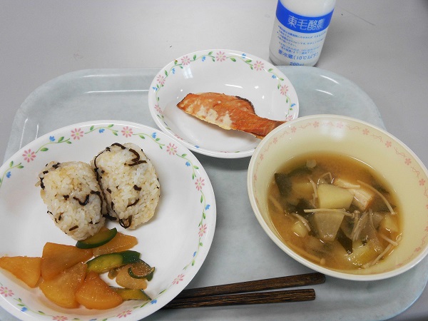 また1月にある学校給食週間では、お弁当を持ってこれない子どもたちに向けて施された給食の発祥にちなんで、おにぎりを中心とした献立です。
