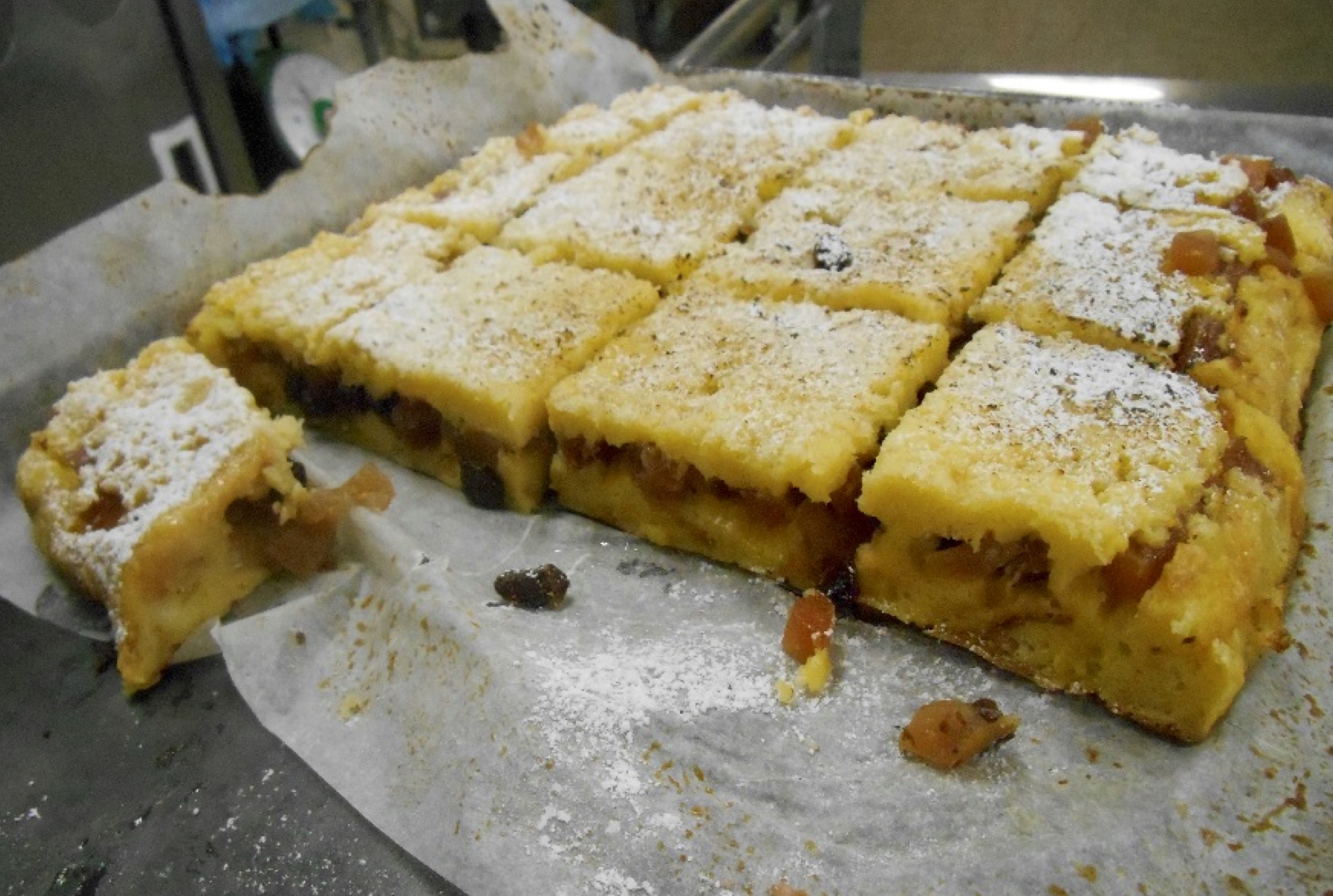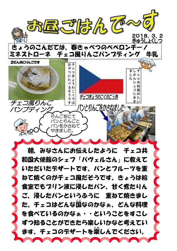 4年ごとになりますがオリンピックの時にも、オリンピックにちなんだ給食を取り組みます。特に東京オリンピックでは、国際理解の対象として学校が担当していたチェコ共和国に親しむ給食も行いました。堅めのパンを玉子に浸し、煮林檎とミルフィーユ状に重ね、表面にはパン粉などをあしらい焼き上げた、チェコ風リンゴパンプディングです。正直に言えば、そもそもチェコの料理はさっぱり想像が着きませんでした。そこで調理員さんと一緒にチェコの大使館を訪れ、大使館のシェフから教わることで実現できました。