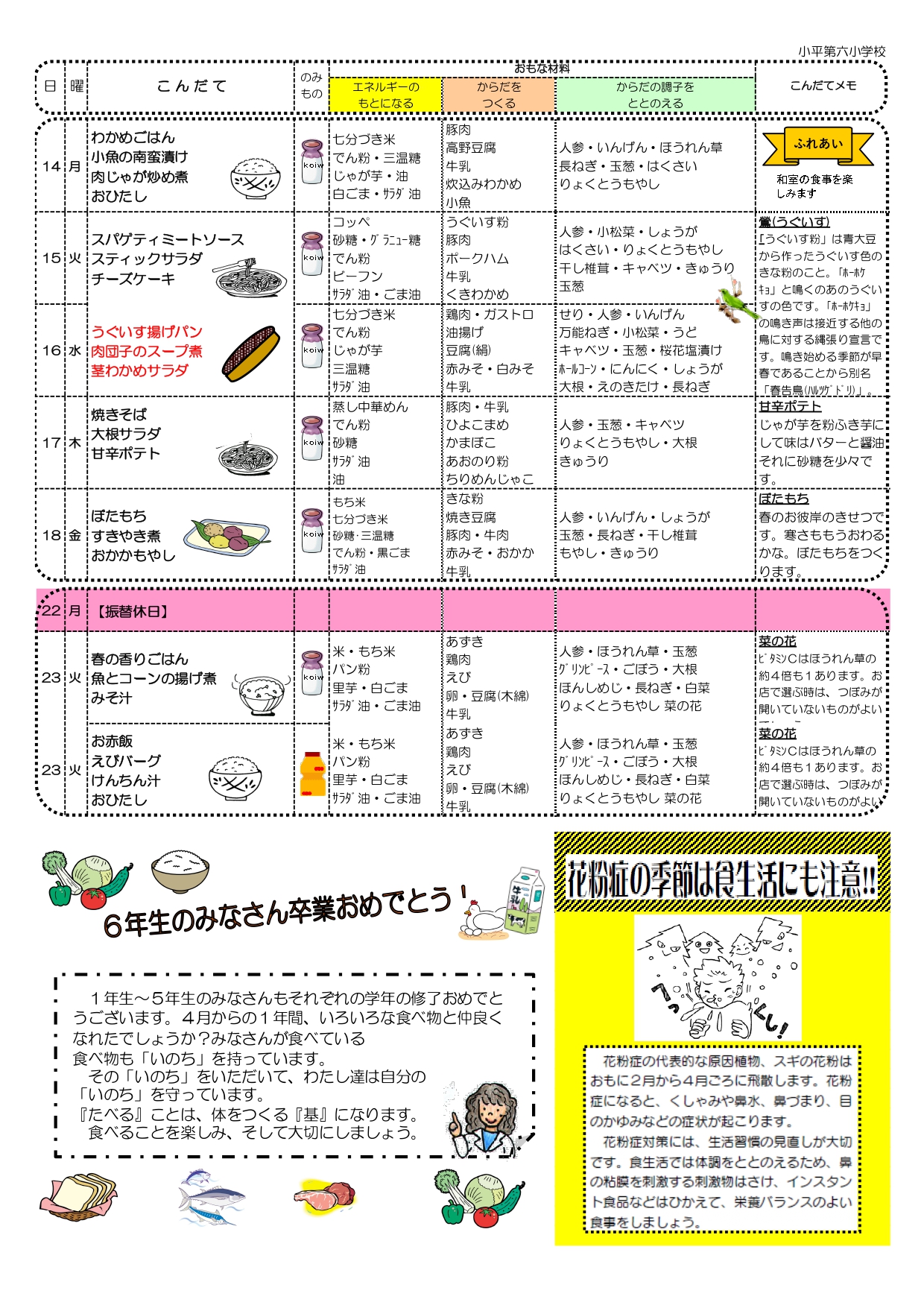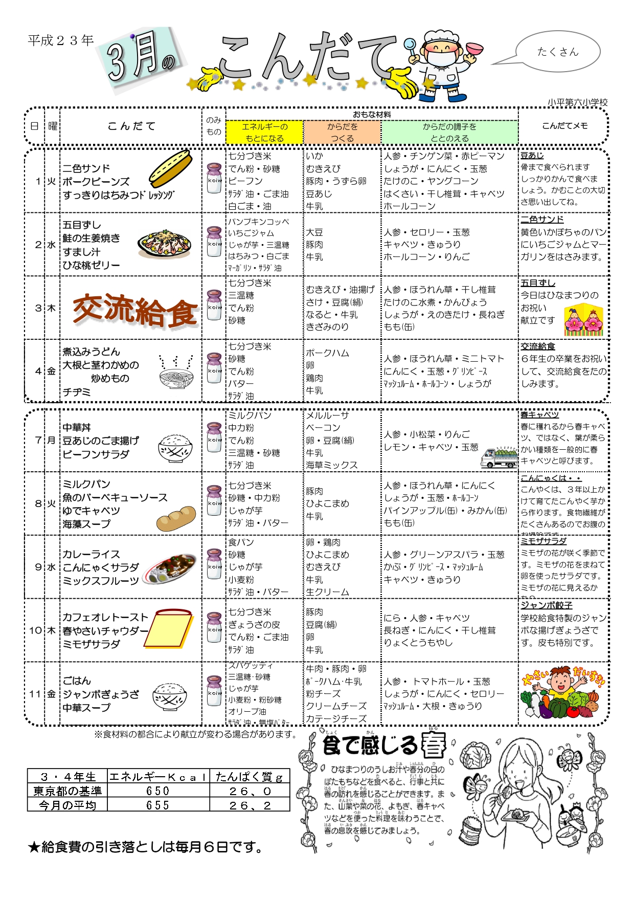 「子どもたちがいる限り食べさせます」、多くの課題に対し、流通の問題では産地の入れ替えなどで対応しました。幸い小平市は契約している牛乳屋さんが供給できると約束も得られていたので、できる手応えも感じていました。計画停電に関しては、対応策を栄養士・調理員と話し合い、ガス復旧の段取りや、調理時間・工程の検討などで、解決方法を探りながら進めるということになりました。結果的にはですが、やってみたら想像より問題なく乗り越えられましたが、当時は、どんな障害が生じるか予断の出来ない中での取り組みでした。小平市では、3.11のあった3月、メニューを変更することなく給食を提供しました(画像、献立表の再現)。